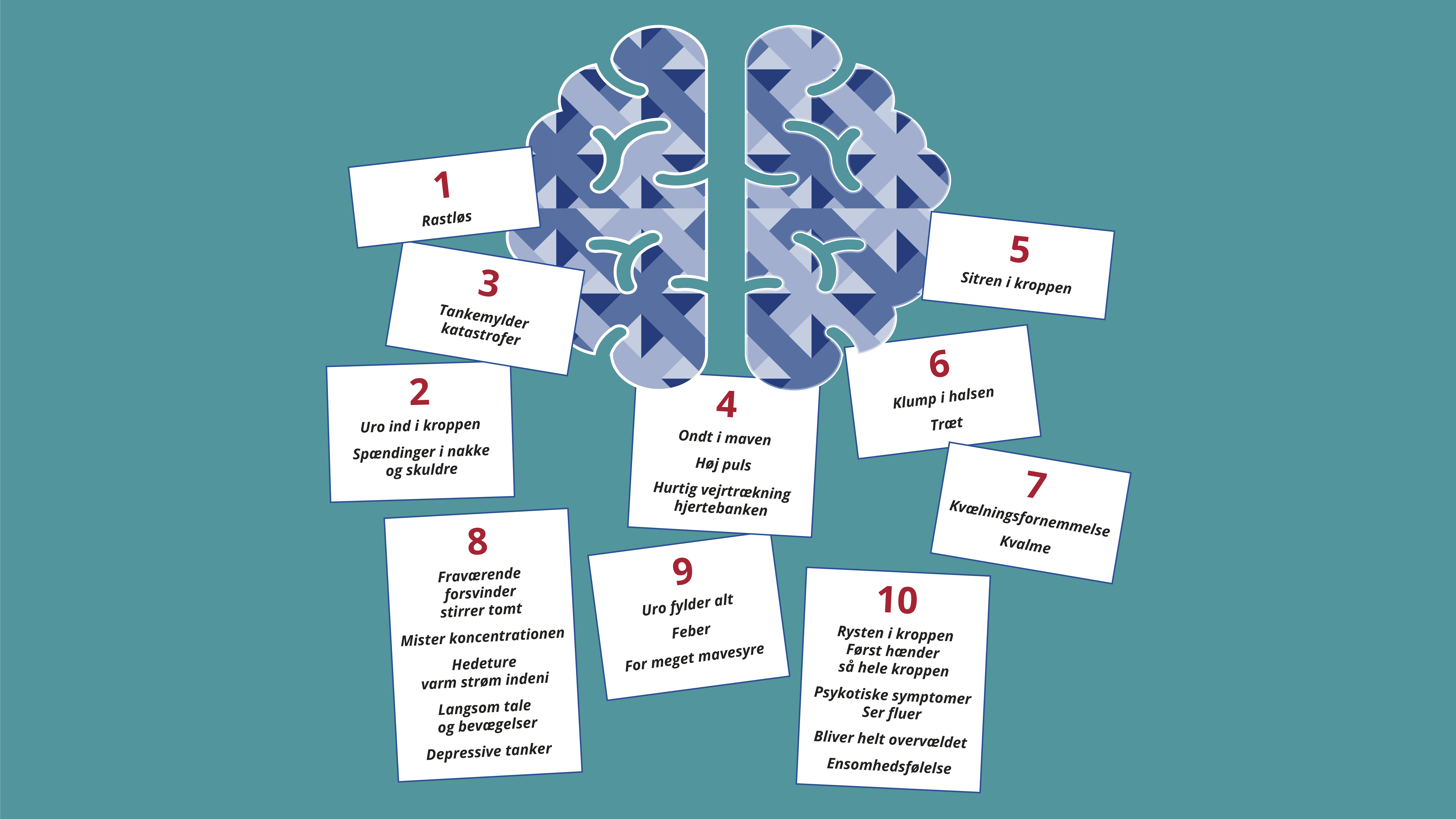 Pernille havde skrevet en brainstorm med 24 fornemmelser, hun havde i kroppen. Hun gav hver fornemmelse et tal fra 1 til 10 ud fra, hvor ubehagelige de var: Rastløshed (1), ondt i maven (4), sitren i kroppen (5), kvælningsfornemmelse (7), ensomhedsfølelse (10), psykotiske symptomer – ser fluer (10).