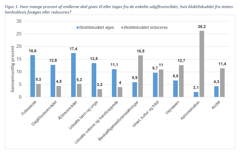 VIVE har op til dette års kommunalvalg og de to seneste før det spurgt lokalpolitikerne om, hvordan de ville prioritere mellem forskellige udgiftsområder, hvis statens bloktilskud til kommunerne blev henholdsvis øget eller beskåret. Her er svaret, at skoler, dagtilbud, ældreområdet og området for udsatte børn og unge bliver prioriteret højest, hvis der bliver flere penge til rådighed: 60 pct. af eventuelle ekstra ressourcer skal ifølge lokalpolitikerne gå til disse fire områder, fordelt med omkring 17 pct. til henholdsvis skoler og ældre og omkring 13 pct. til henholdsvis dagtilbud og udsatte børn/unge. Endelig mener lokalpolitikerne også, at udsatte voksne og handicappede bør tilgodeses med 11 pct.