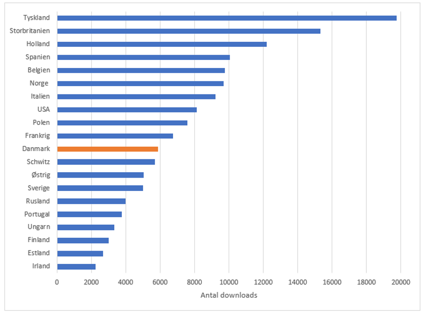 Antal download fra databasen fordelt på lande (top 20), senest opdateret den 10. april 2024