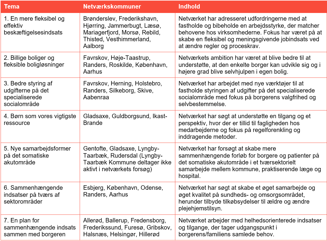 Frikommuneforsøget er organiseret under en række temaer, hvor udvalgte kommuner får mulighed for at afprøve nye måder at varetage de kommunale opgaver på. Der er syv frikommunenetværk med hvert deres overordnede tema. I alt 38 kommuner indgår i frikommunenetværkene - se skemaet nederst på siden.