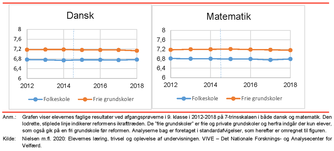 Udvikling i faglige resultater i 9. klasse fordelt på folkeskoler og frie grundskoler