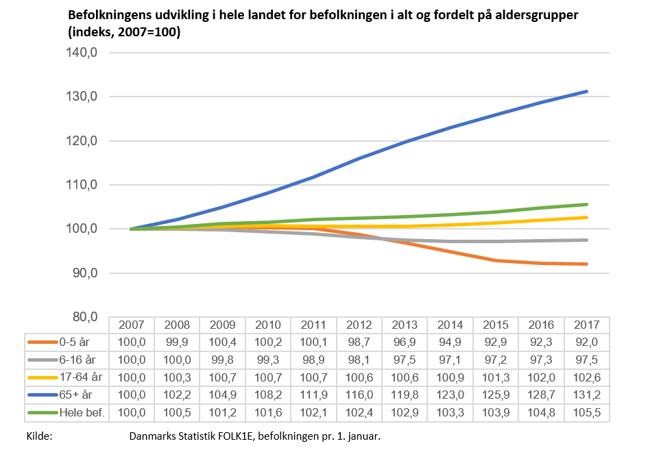 Samlet set er befolkningstallet i Danmark steget med knap seks procent fra 2007 til 2017, viser dette notat. Samtidig har fordelingen af aldersgrupper ændret sig drastisk i perioden.