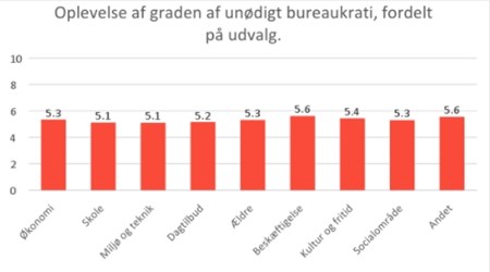 Ser man på oplevelsen af unødigt bureaukrati fordelt på de forskellige politiske udvalg, er der forskel på, i hvor høj grad man oplever, at det sander til. Det største lokale råderum findes umiddelbart i miljø- og teknikudvalgene. De politikere, der sidder her, synes i mindre grad, at der er unødigt bureaukrati. Omvendt synes politikerne i beskæftigelsesudvalgene at have den største oplevelse af, at det sander til.