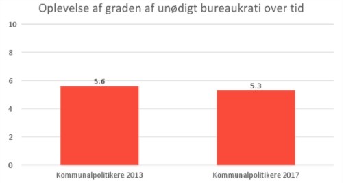 Det er vigtigt at have for øje, at spørgsmålet måler kommunalbestyrelsesmedlemmernes subjektive opfattelse af unødigt bureaukrati og således netop udtrykker politikerens egen vurdering. Andre grupper kan have andre vurderinger, og absolutte mål for graden af bureaukrati kan vise andre resultater. Ikke desto mindre er det interessant, at der er sket et signifikant fald i oplevelsen af unødigt bureaukrati.