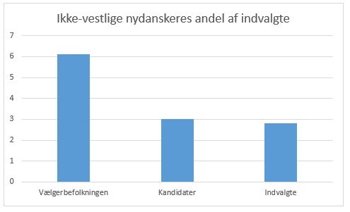 Figuren viser ikke-vestlige nydanskeres repræsentation i dansk kommunalpolitik. Ved det seneste valg i 2013 udgjorde gruppen cirka 6,1 procent af vælgerbefolkningen, men kun 3,0 procent af kandidaterne og 2,8 procent af de indvalgte. Med andre ord er der lidt under halvt så mange ikke-vestlige nydanskere i kommunalbestyrelserne i forhold til, hvad man ville forvente ud fra deres andel blandt vælgerne.