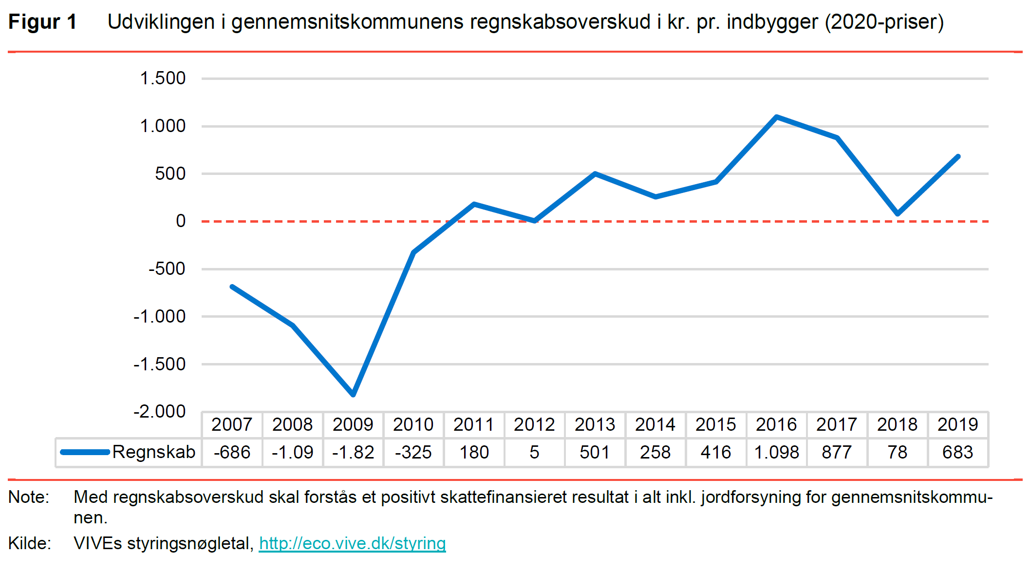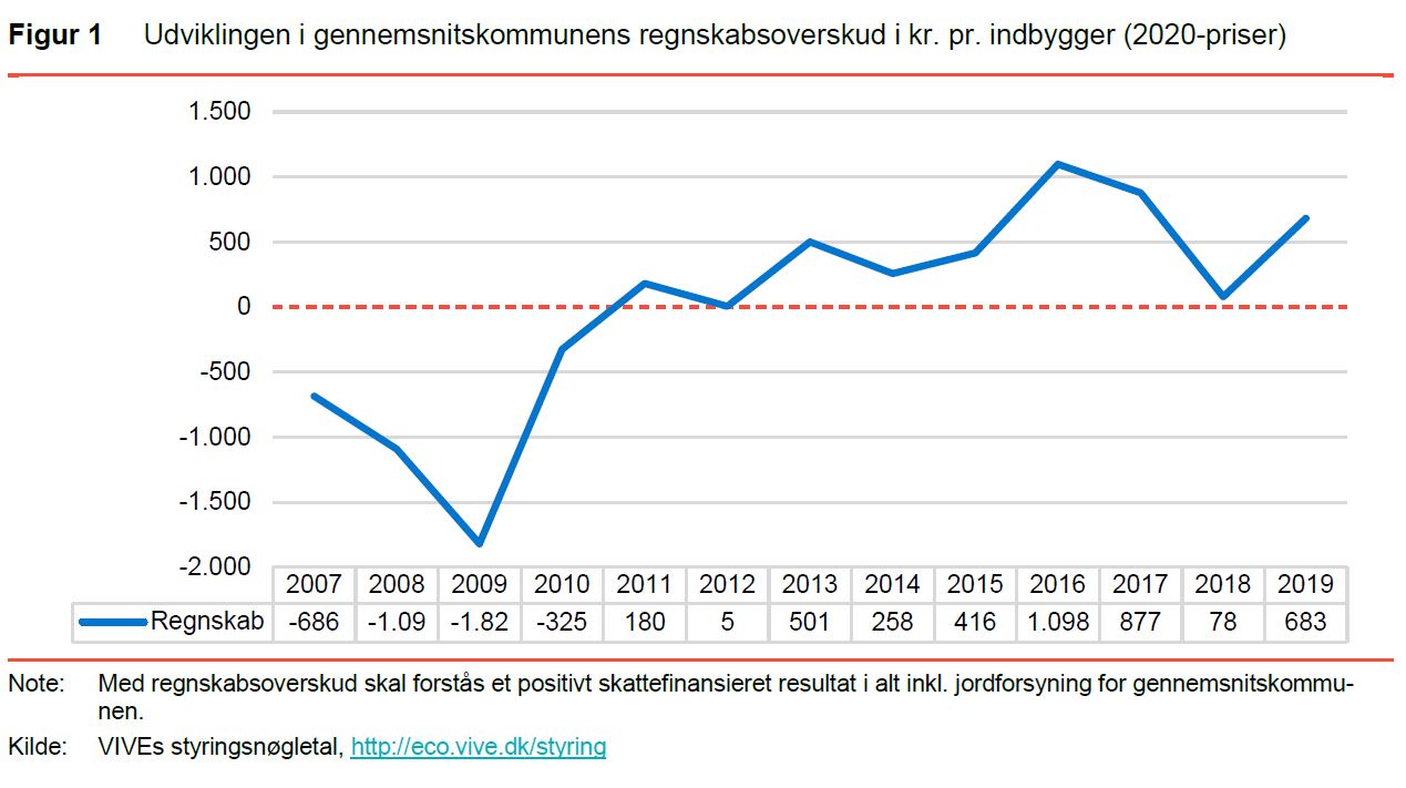 VIVEs opgørelse viser, at gennemsnitskommunen, som er et uvægtet gennemsnit af landets kommuner, har et regnskabsoverskud på knap 700 kr. pr. indbygger i 2019. Dermed fortsætter en mangeårig tendens med et positivt skattefinansieret resultat hos gennemsnitskommunen. Se udviklingen i regnskabsoverskuddet gennem årene i figur 1.