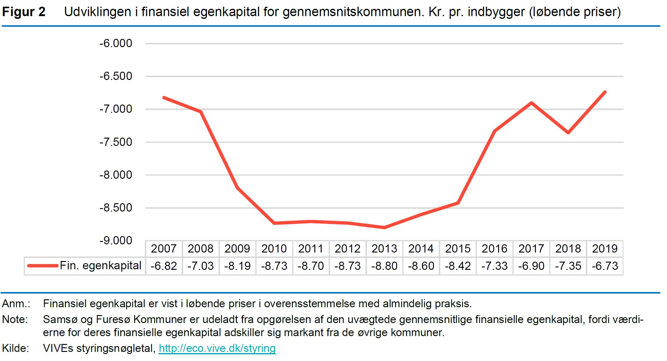VIVEs opgørelse af kommunernes finansielle egenkapital peger på, at gennemsnitskommunen er finansielt bedre stillet ved udgangen af 2019, end den har været i flere år. Den finansielle egenkapital beskriver kort sagt den samlede skattefinansierede formue. Her ses, at gennemsnitskommunens finansielle egenkapital er gået fra at ligge på cirka -8.800 kr. pr. indbygger i 2013 til cirka -6.700 kr. pr. indbygger i 2019. Selvom forbedringen af den finansielle egenkapital er sket bredt på tværs af kommuner, er det vigtigt at påpege, der fortsat er forholdsvis stor forskel på niveauet kommunerne imellem. Se udviklingen i gennemsnitkommunes finansielle egenkapital siden 2007 i figur 2.