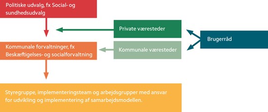 Projektorganiseringen af samarbejdsmodellen er bygget op omkring en styregruppe, et implementeringsteam og arbejdsgrupper nedsat af implementeringsteamet. I disse samarbejdsorganer sidder repræsentanter fra væresteder, beskæftigelses- og socialforvaltning og brugerråd. Projektet er forankret i beskæftigelses- og socialforvaltningen.