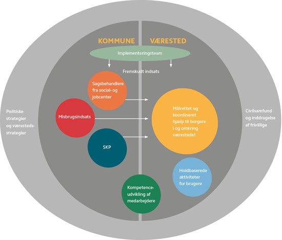 Det styrkede samarbejde mellem kommuner og væresteder består af en række elementer, der skal understøtte hinanden og sikre en sammenhængende og koordineret hjælp til borgere.